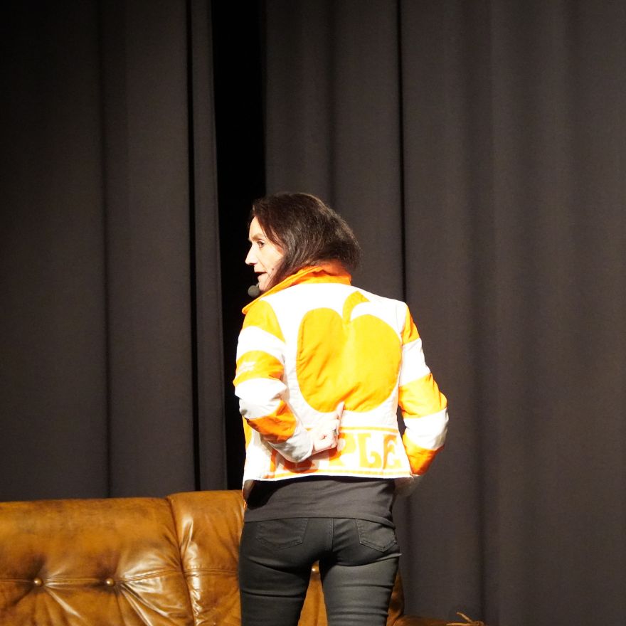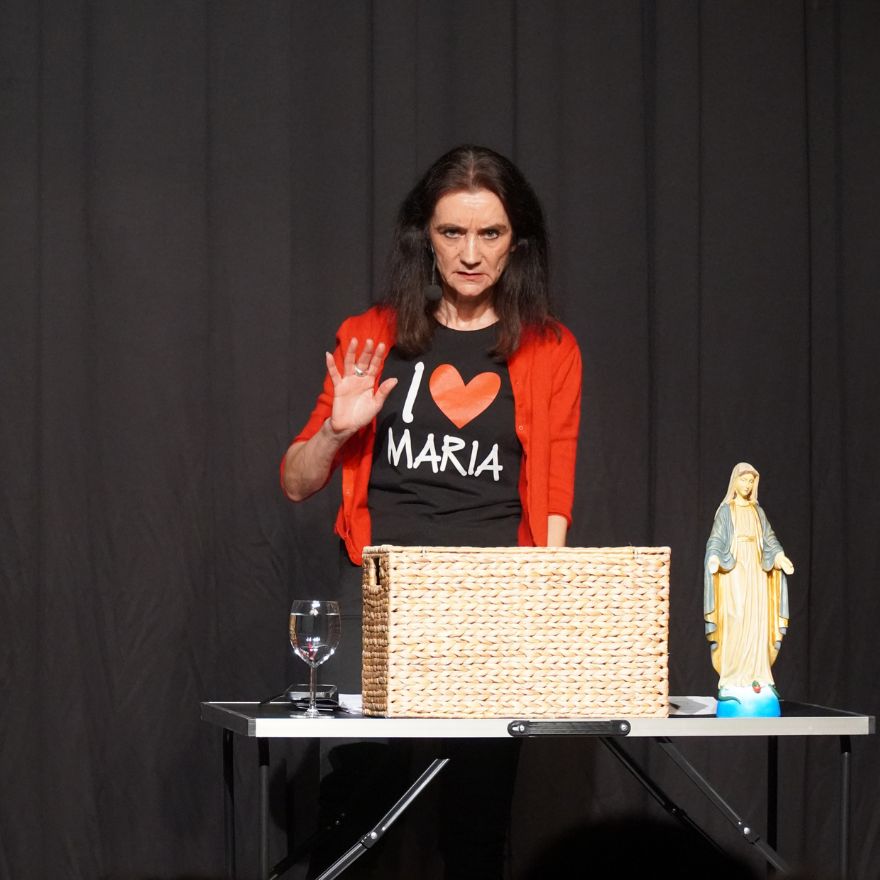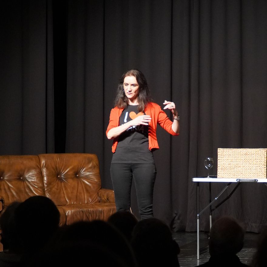 Besonders eindrucksvoll war ihre satirische Auseinandersetzung mit dem derzeit viel diskutierten rückläufigen Emanzipationstrend, den sie mit scharfem Witz und klarer Haltung kommentierte. Auch patriarchalische Strukturen nahm sie gekonnt aufs Korn – ebenso wie ein „gewisses Unternehmen“, das nicht zufällig einen angebissenen Apfel als Logo tragen könne – schließlich erinnere der Apfel doch stark an den biblischen Sündenfall.