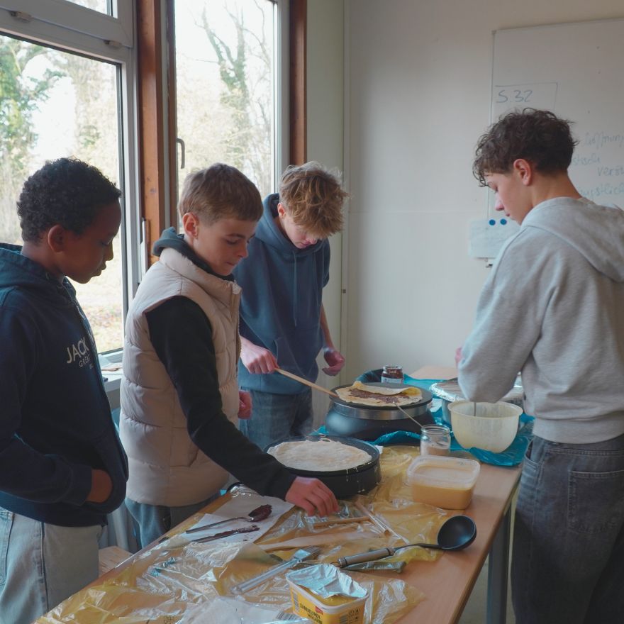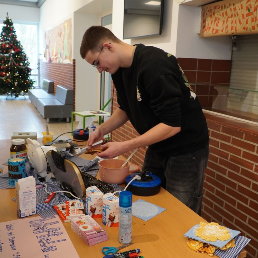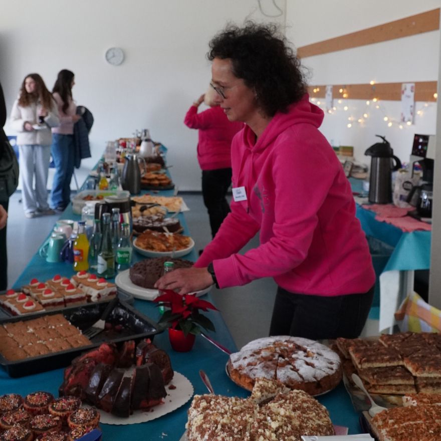 Natürlich kam auch das leibliche Wohl nicht zu kurz: In der Cafeteria warteten leckere Kuchen und Getränke. Die Q1 verwöhnte die Gäste in der Pausenhalle mit frisch gebackenen Waffeln, und der verführerische Duft von Crêpes zog viele Interessierte zur Fachschaft Französisch. In der Pausenhalle wurden zusätzlich Kinderschminken und bunte Strähnchen angeboten, was vor allem bei den jüngeren Besucherinnen und Besuchern für Begeisterung sorgte.