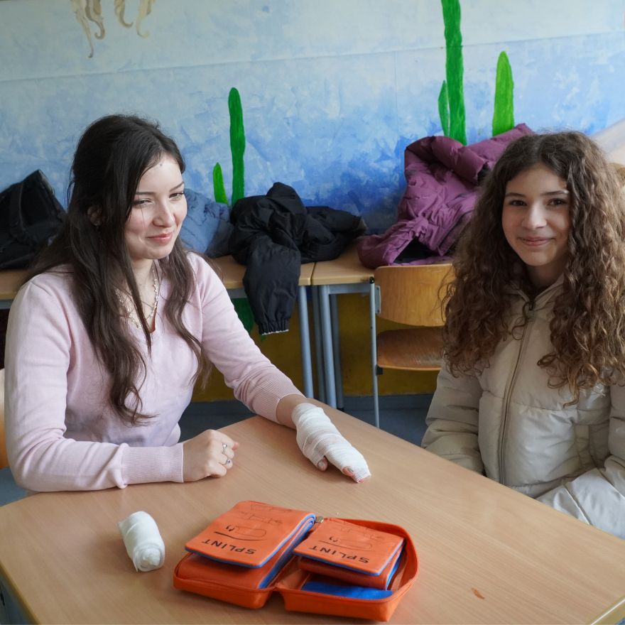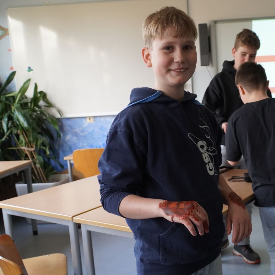 Mut war ebenfalls gefragt bei der Sani-AG, denn dort wurden zuvor präparierte „Wunden“ professionell versorgt und verbunden. So sah man an diesem Tag so manche Besucherin und manchen Besucher stolz mit einem Verband durch die Schule laufen.